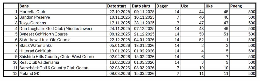 - Poengfordeling etter Trackman sitt system for “order of Merit”. (En får poengfordeling etter plassering for hver enkelt runde, som samlet gir tellende resultatliste.)